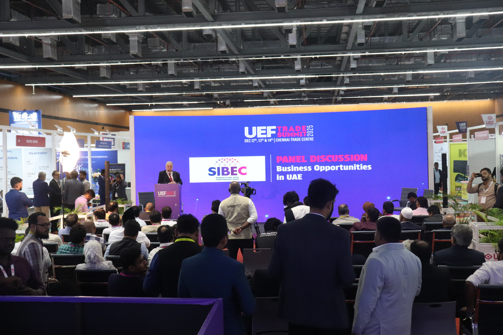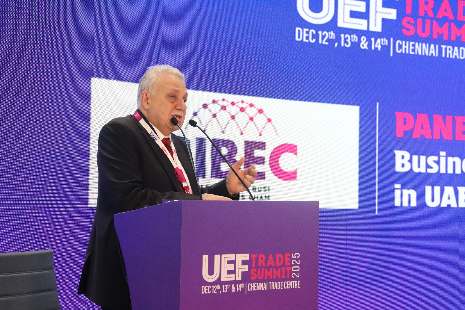 Dr. Waiel Awwad addressing business leaders at the UEF Trade Summit in Chennai